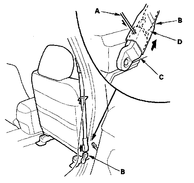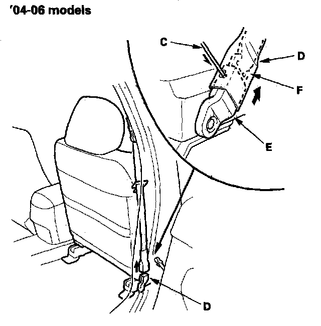 - '04-06 models passenger's seat belt: Carefully insert the tip of a small screwdriver (C) through the hole in the back of the front seat belt lower anchor cover (D) and into the hole in the front seat belt lower anchor (E).