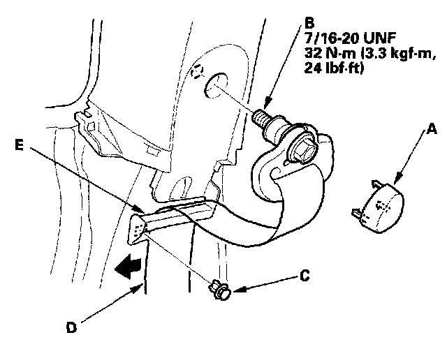 6. Remove the upper anchor cap (A), and remove the upper anchor bolt (B). Release the clip (C), then release the front seat belt (D) from the seat belt guide (E).