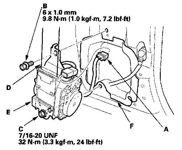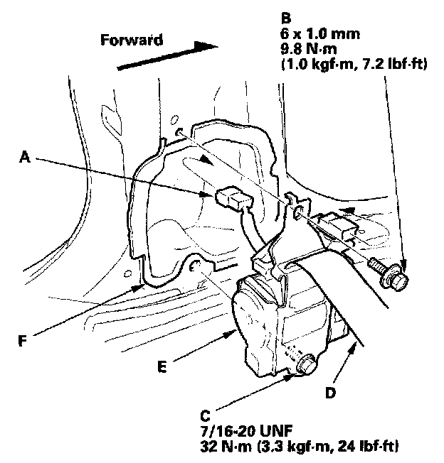 Unlock the lower anchor by pushing in on the screwdriver. Remove the screwdriver, and then detach the front seat belt anchor plate (F) and anchor cover from the lower anchor.