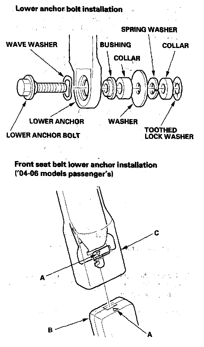 - '04-06 models passenger's seat belt: Before attaching the front seat belt lower anchor, make sure there are no twists or kinks in the belts. Triangle marks (A) on the anchor plate (B) and on the lower anchor (C) must face the same side. Insert the hook on the anchor plate into the lower anchor, and be sure that the lower anchor is locked securely.