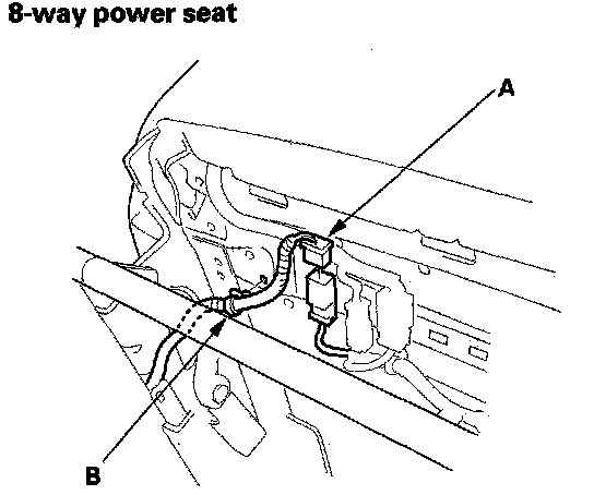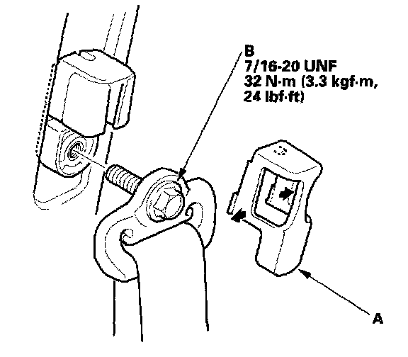 - '03 model driver's and passenger's seat belts and '04-06 models driver's seat belt: Remove the lower anchor cap (A), and remove the lower anchor bolt (B).
