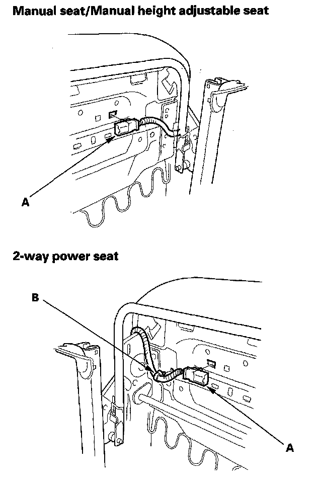 5. Detach the seat belt switch connector (A) and harness clip (B).