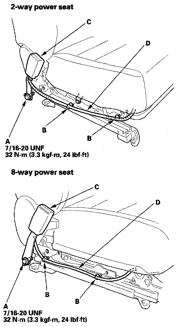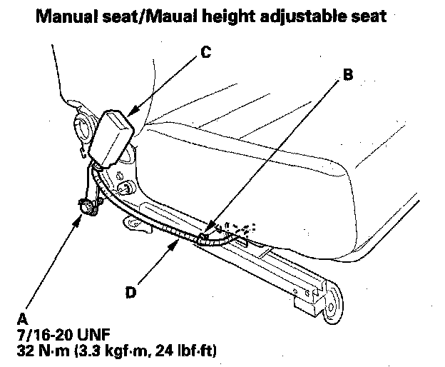 7. Pull the seat belt switch harness (D) out through the space between the seat cushion and the seat linkage (except manual seat), or through the hole in the seat track (manual seat).