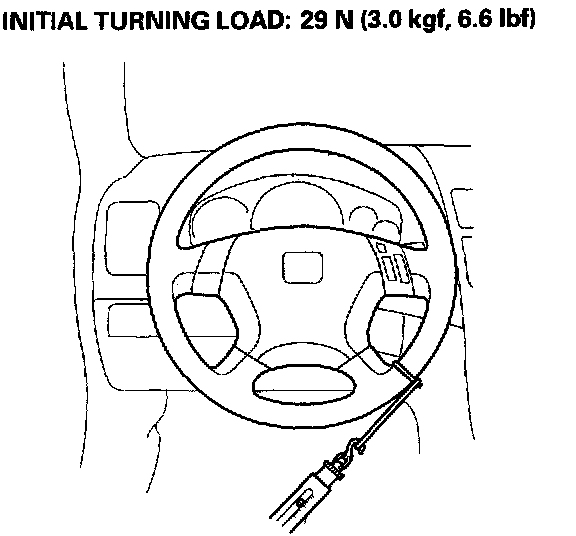 3. Attach commercially-available spring scale to the steering wheel. With the engine idling and the vehicle on a clean, dry floor, pull the scale as shown and read it as soon as the tires begin to turn.