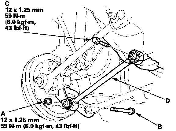 4. Remove the flange bolt (C), and remove the lower arm (D).