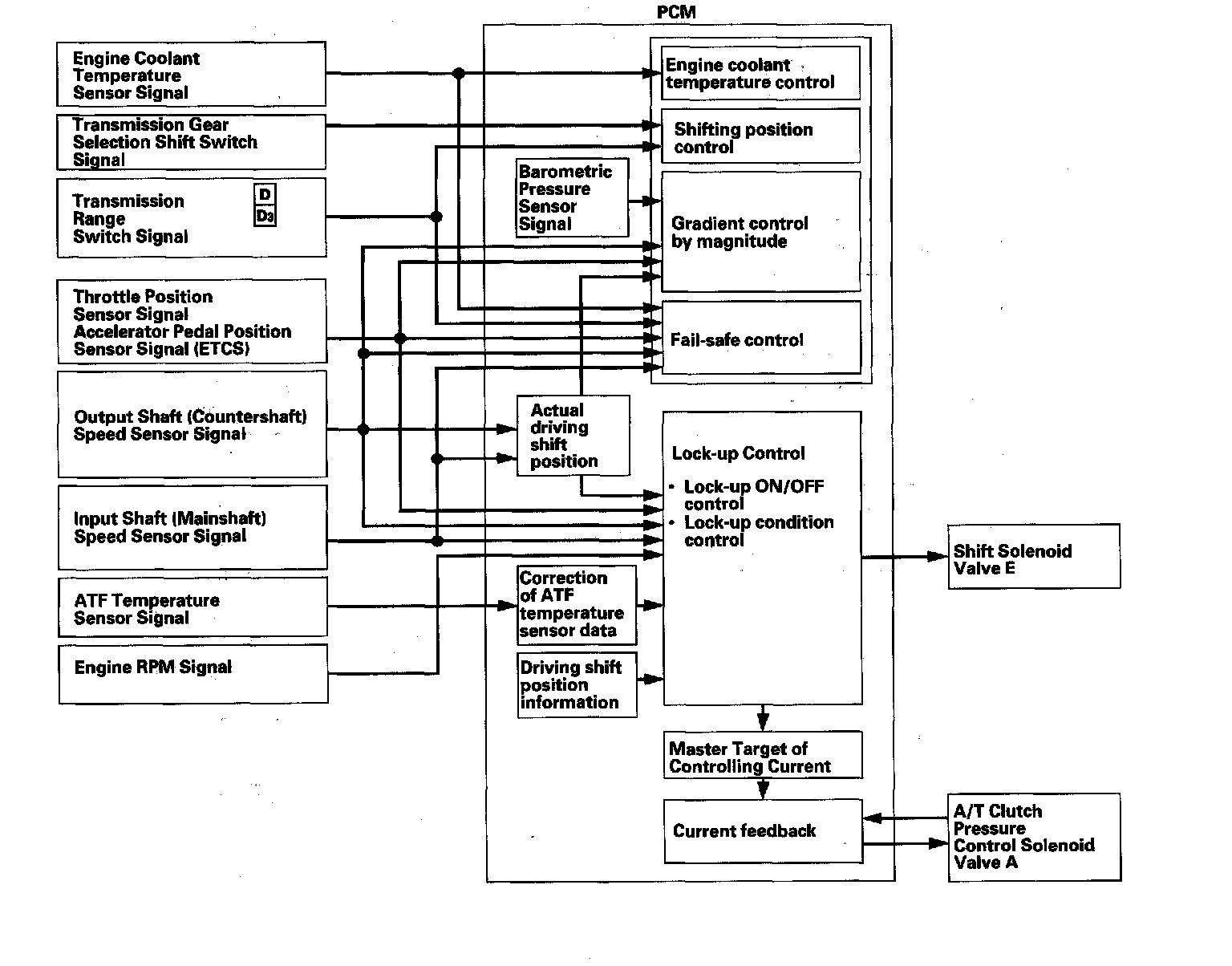 The PCM instantly determines which gear should be selected by various signals sent from sensors and switches, and it actuates the shift solenoid valves A, B, C, D, and E to control shifting.