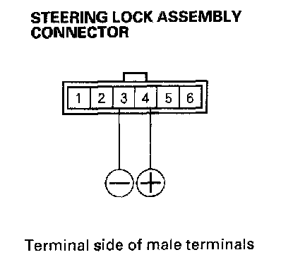 4. Connect the battery positive terminal to steering lock assembly connector terminal No. 4, and connect the battery negative terminal to No. 3 terminal. Make sure that the ignition key cannot be turned to LOCK (0) position. Release the battery terminals, and make sure that the key can be turned to LOCK (0) position and removed from the cylinder.