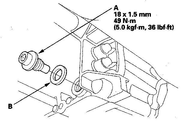3. Remove the drain plug (A), and drain the automatic transmission fluid (ATF). Then reinstall the drain plug with a new sealing washer (B).