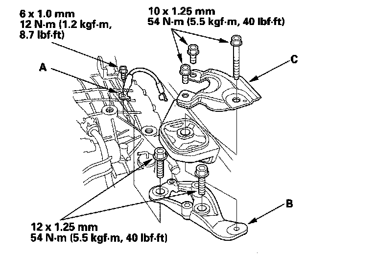 8. Remove the ground cable (A), transmission upper mount bracket (B), and bracket plate (C).