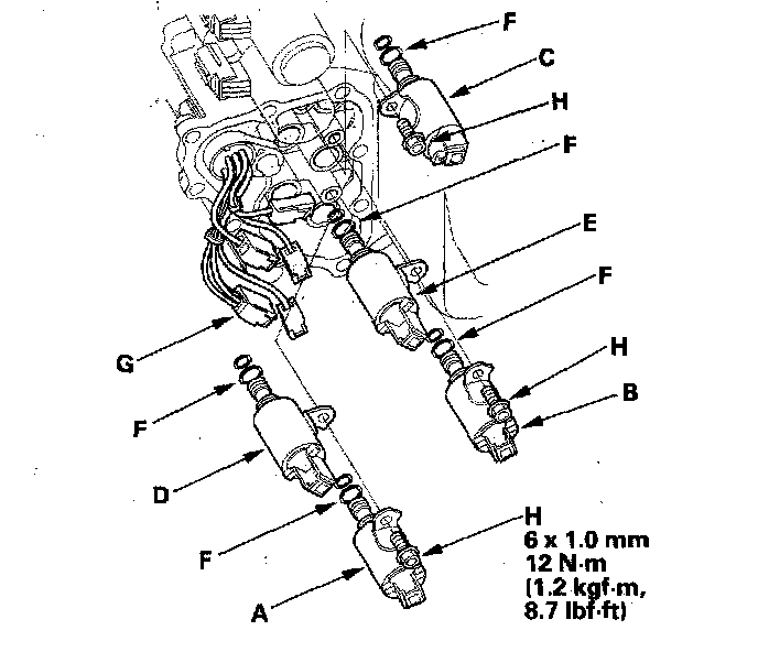 17. Install the shift solenoid valves A and B. While holding the shift solenoid valve body, be sure to install the solenoid valves until their mounting brackets contact the bracket of the installed solenoid. Install the solenoid mounting bolts (H) and tighten them.