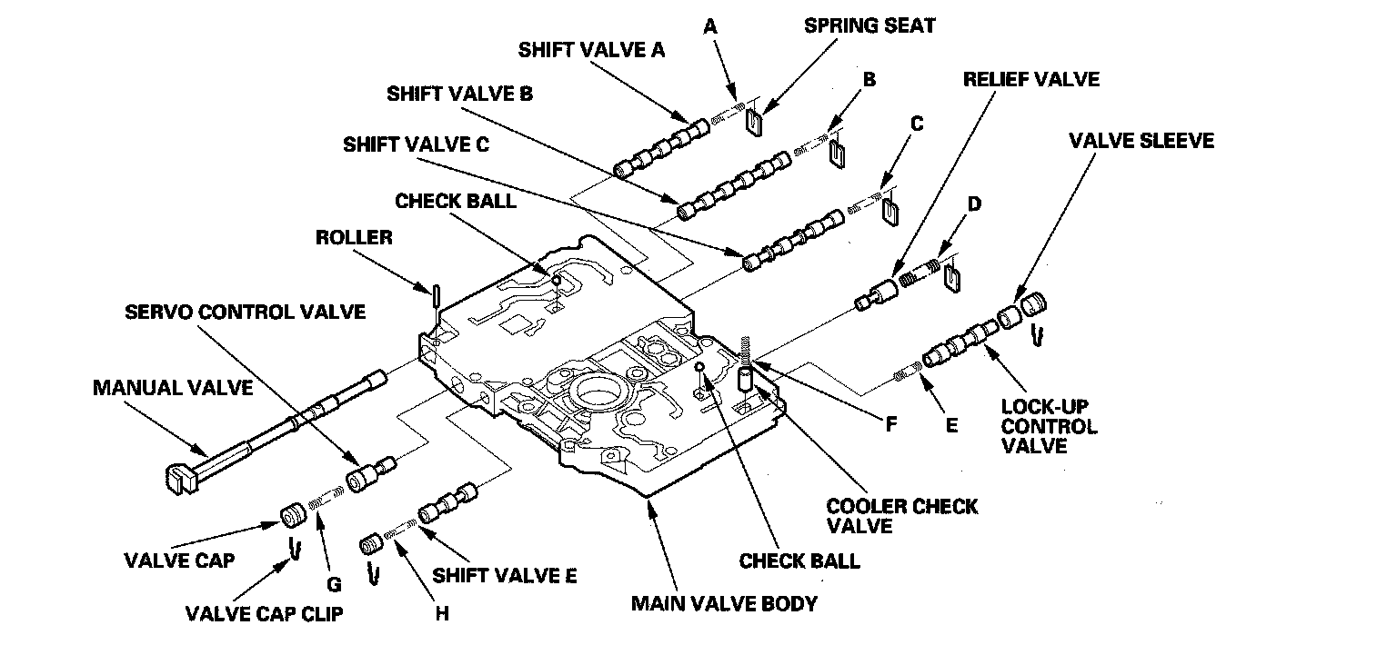 4. Check all valves for free movement. If any fail to slide freely, refer-to valve body repair.