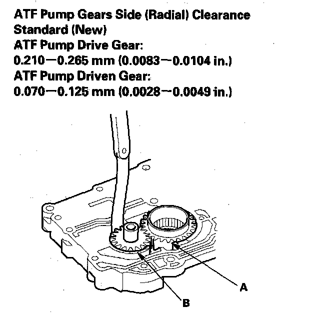 2. Measure the side clearance of the ATF pump drive gear (A) and driven gear (B).