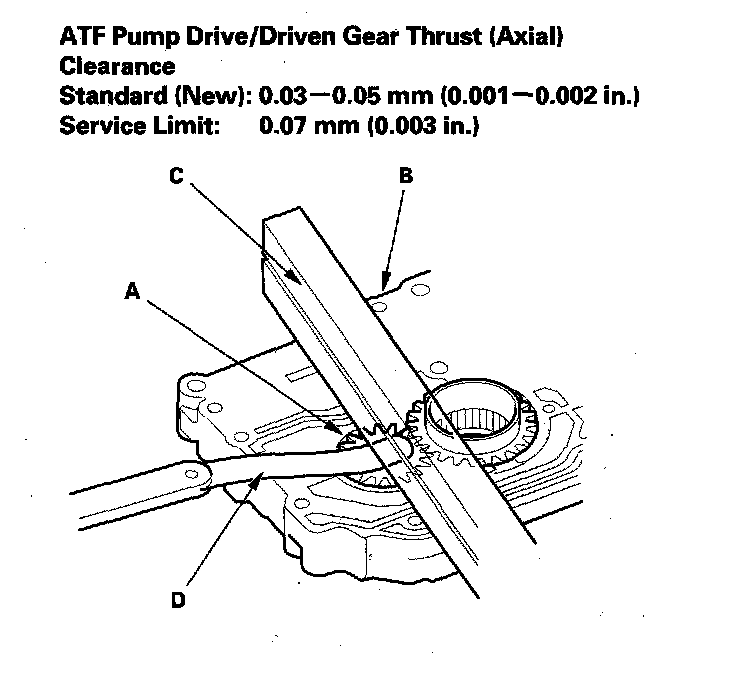 3. Remove the ATF pump driven gear shaft. Measure the thrust clearance between the ATF pump driven gear (A) and the valve body (B) with a straight edge (C) and a feeler gauge (D).