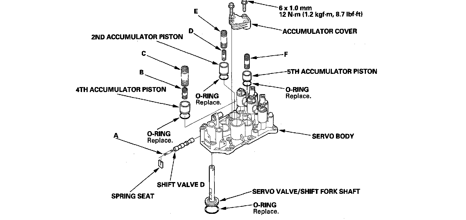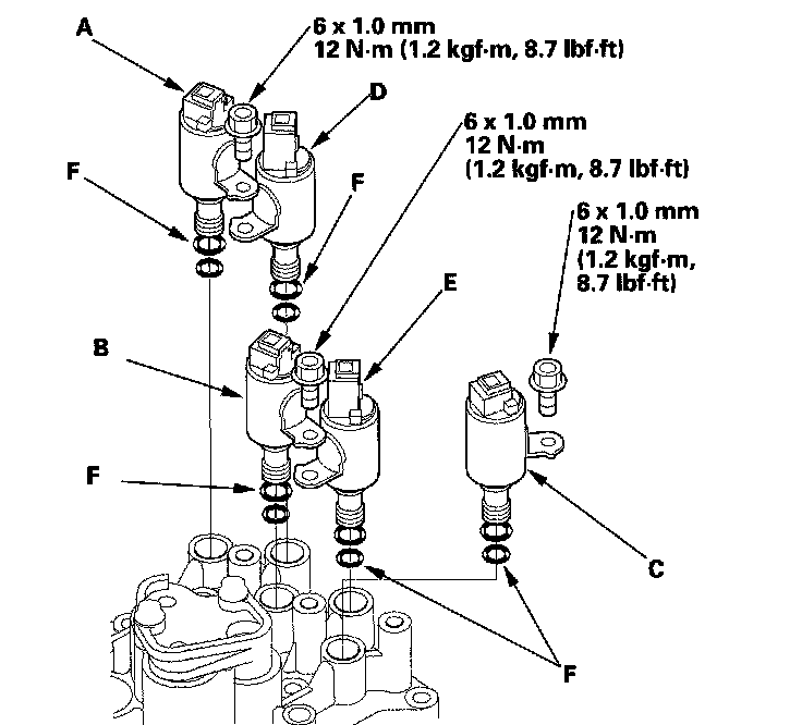 ^ Do not install the shift solenoid valve A before installing the shift solenoid valve D, and do not install shift solenoid valve B before solenoid valve E. If solenoid valves A and B are installed before solenoid valves D and E, it may damage the hydraulic control system.