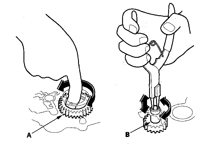 4. Make sure the ATF pump drive gear (A) rotates smoothly in the normal operating direction, and the ATF pump driven gear shaft (B) moves smoothly in the axial and normal operating direction.