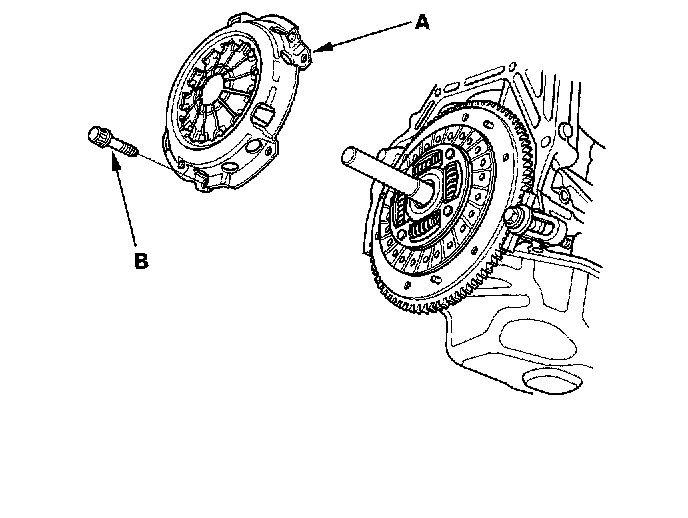 3. To prevent warping, unscrew the pressure plate mounting bolts (A) in a crisscross pattern in several steps, then remove the pressure plate (B).