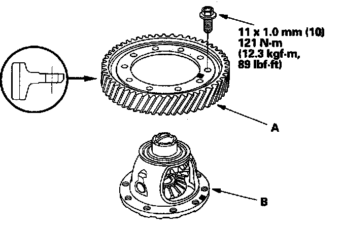 Differential Carrier, Final Driven Gear Replacement1. Remove the bolts (left-hand threads) in a crisscross pattern in several steps, then remove the final driven gear (A) from the differential carrier(B).