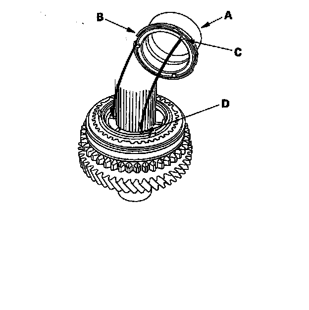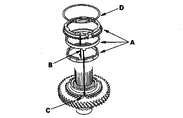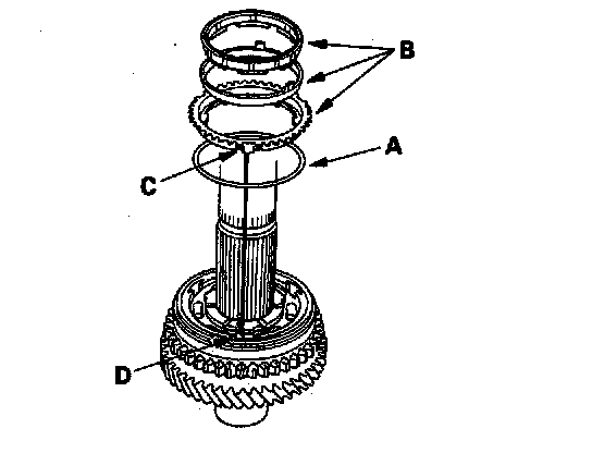 3. Install the triple cone synchro assembly (A) by aligning the synchro cone fingers (B) with 1st gear grooves (C), then install the synchro spring (D).