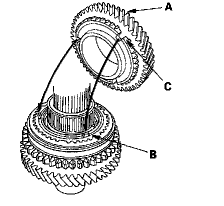 10. Install 2nd gear (A) by aligning the synchro cone fingers (B) with the 2nd gear grooves (C).
