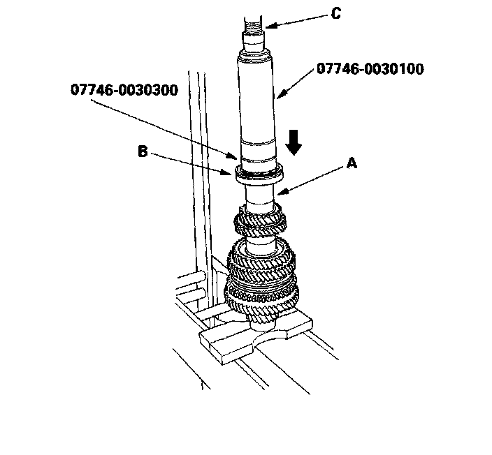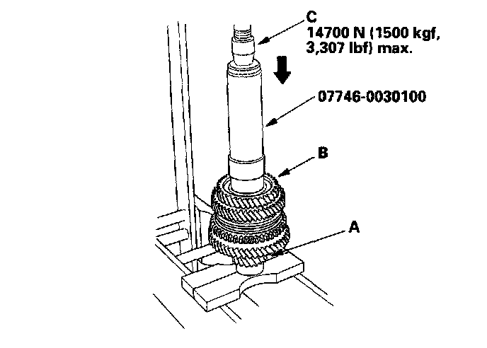 11. Support the countershaft (A) on steel blocks, then install 3rd gear (B) using the special tool and a press (C). Do not exceed the maximum pressure.