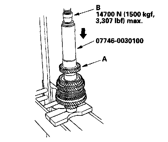 12. Install 4th gear (A) using the special tool and a press (B). Do not exceed the maximum pressure.