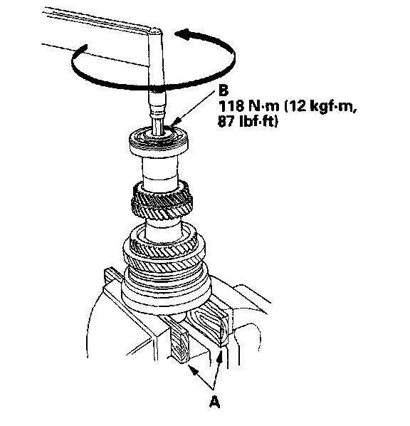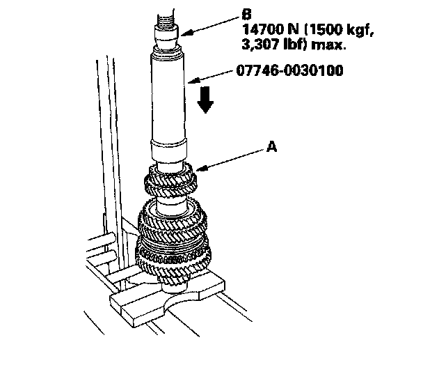 13. Install 5th gear (A) using the special tool and a press (B). Do not exceed the maximum pressure.