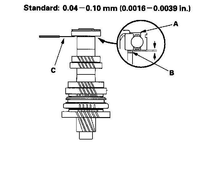 15. Measure the clearance between the old bearing (At and the 35 mm shim (B) with a feeler gauge (C).