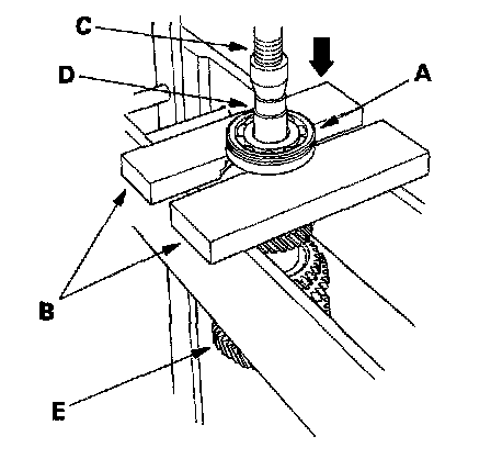 17. Support the ball bearing (A) on steel blocks (B), then use a press (C) and an attachment (D) to press the countershaft (E) out of the ball bearing.