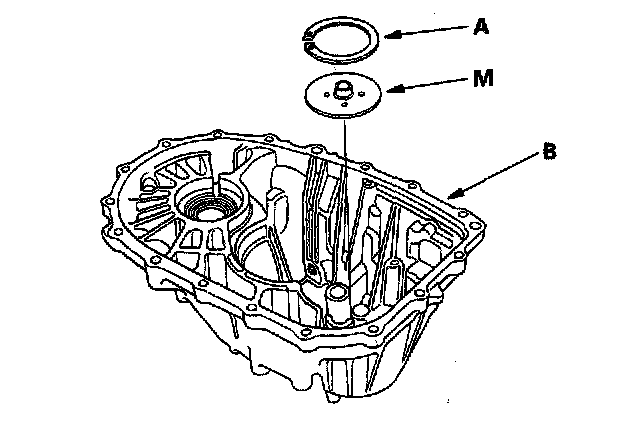 1. Remove the 72 mm shim (A) and oil guide plate M from the transmission dousing (B).