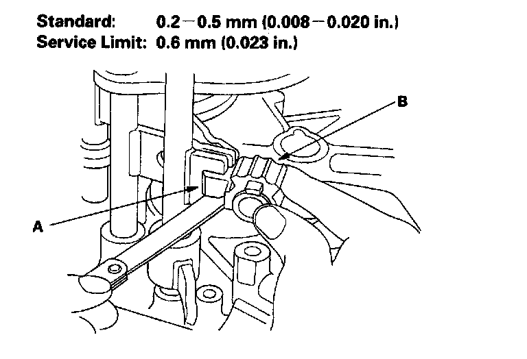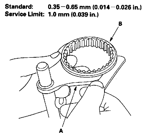1. Measure the clearance between each shift fork (A) and its matching synchro sleeve (B). If the clearance exceeds the service limit, go to step 2.