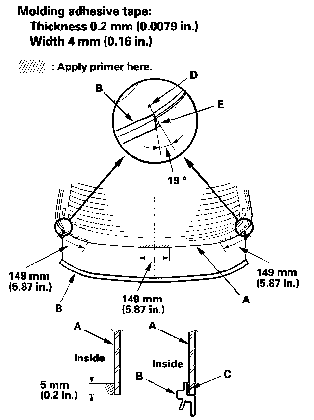13. 4-door: Apply primer to the edge of the rear window (A) where the molding adhesive tape will be attached as shown. Attach the molding (B) with adhesive tape (C) to the lower edge of the rear window: