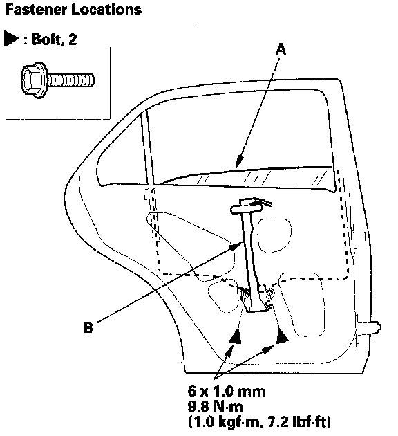 2. Carefully move the glass (A) until you can see the bolts, then remove them. Remove the glass from the regulator (B), and carefully lower the glass. Take care not to drop the glass inside the door.