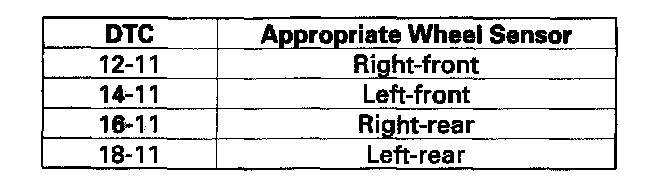 DTC 12-11: Right-front Wheel Sensor Electrical Noise or Intermittent InterruptionDTC 14-11: Left-front Wheel Sensor Electrical Noise or Intermittent Interruption