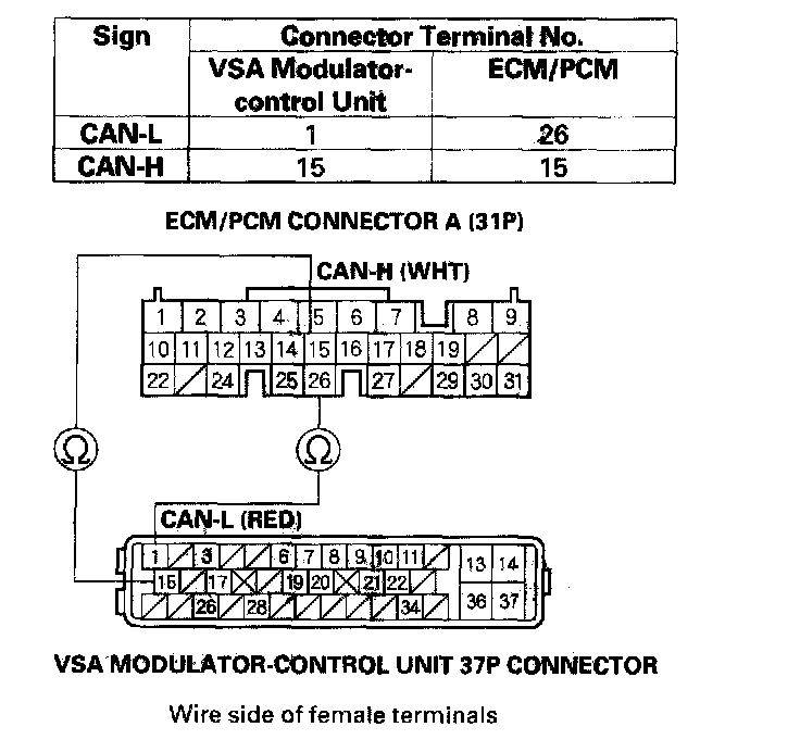 8. Check for continuity between VSA modulator-control unit 37P terminal and ECM/PCM connector A (31P) terminal (see table).