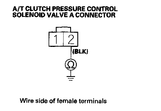 9. Measure resistance between A/T clutch pressure control solenoid valve A connector terminal. No. 1 and No. 2.