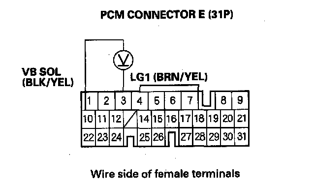 13. Measure voltage between PCM connector terminals E10 and E3.