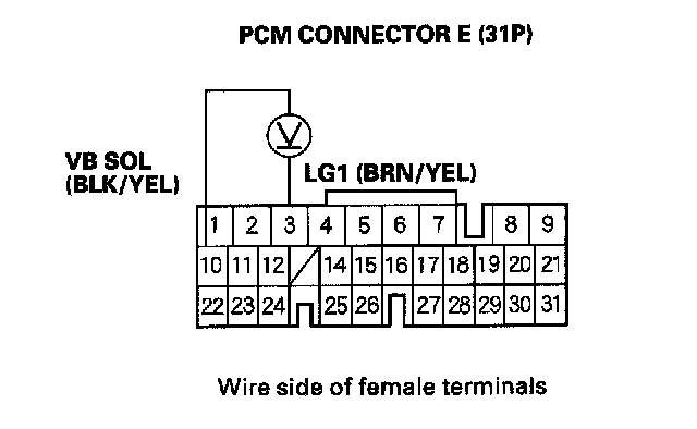 13. Measure voltage between PCM connector terminals E10 and E3.