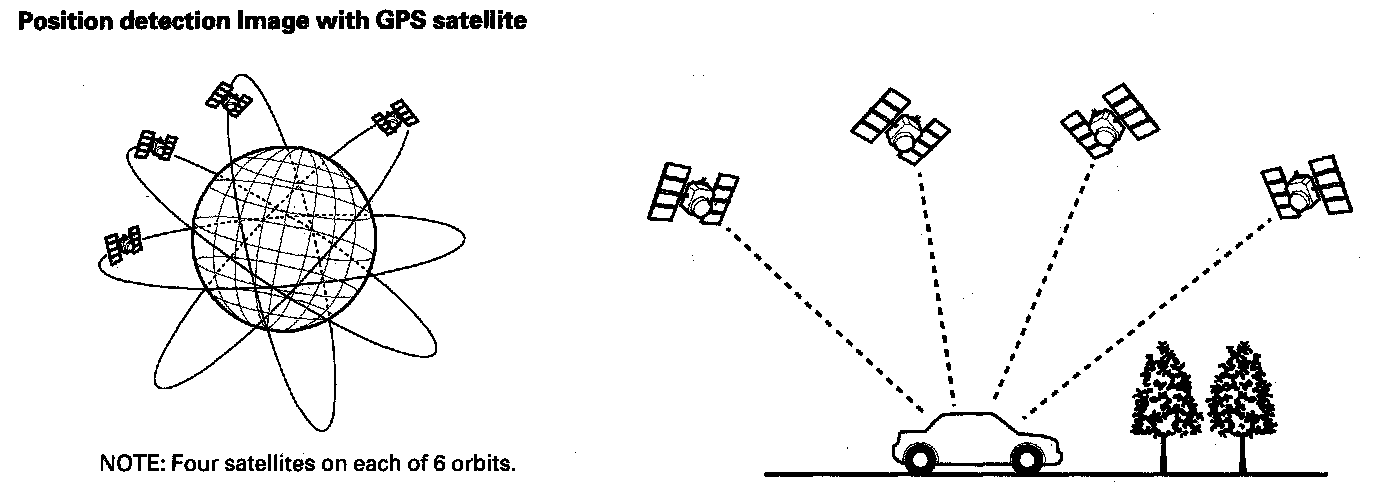 The global positioning system (GPS) enables the navigation system to determine the current position of the vehicle by utilizing the signals transmitted from the satellites in orbit around the earth. The satellites transmit the satellite identification signal, orbit information, transmission time signal, and other information. When the GPS receiver receives a signal from three or more satellites simultaneously, it calculates the current position of the vehicle based on the distance to each satellite and the satellite is position in its respective orbit.
