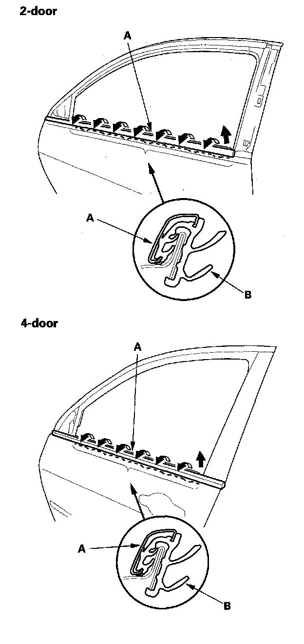 3. Starting at the rear, pull the door glass outer weatherstrip (A) up at each portion where the inner molding (B) catches the inside edge of the window slot.