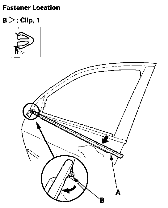 4. Pull the rear of the glass outer weatherstrip (A) away from the door, then release the front clip (B) from the mounting hole in the door. If necessary, pry the clip, then remove the weatherstrip.