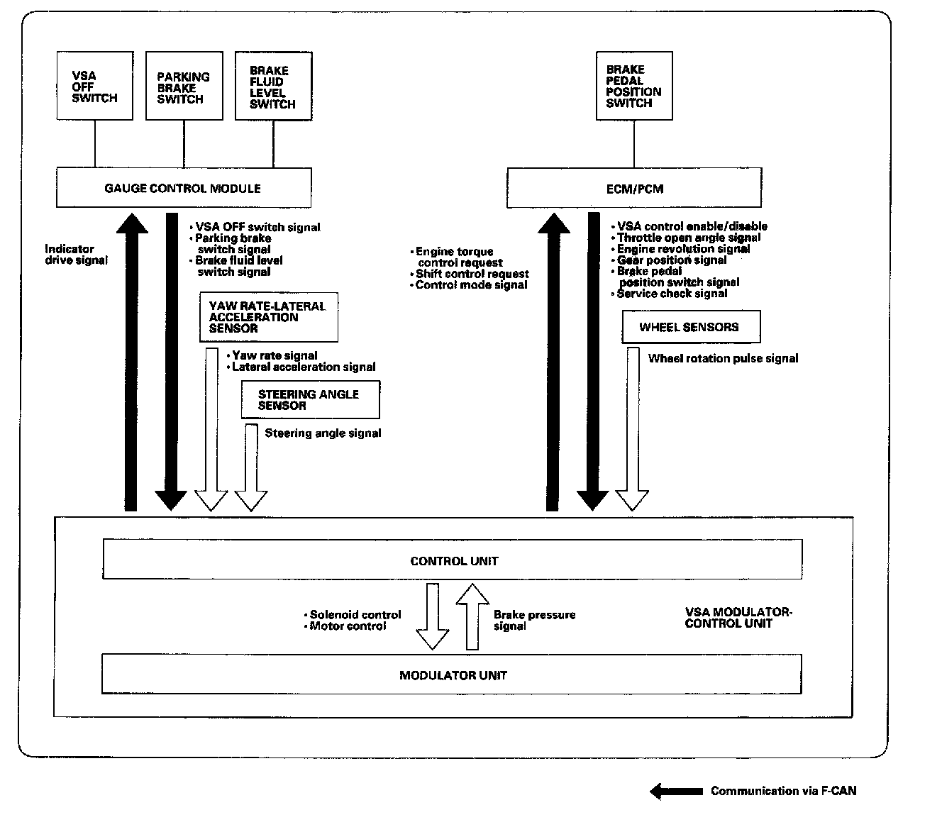 This system is composed of the VSA modulator-control unit, the wheel sensor, the steering angle sensor, and the yaw rate-lateral acceleration sensor, and the system indicators in the gauge control module. The VSA modulator-control unit controls the ABS, EBD, TCS, VSA, and brake assist with the brake pressure of each wheel and the engine torque.