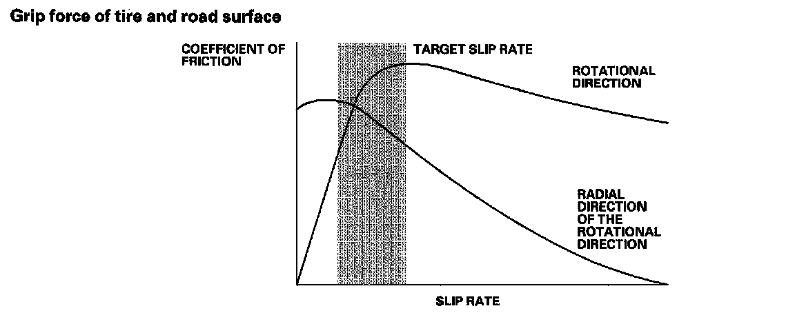 Without ABS, when the brake pedal is pressed while driving, the wheels sometimes lock before the vehicle comes to a stop. In such an event, the maneuverability of the vehicle is reduced if the front wheels are locked, and the stability of the vehicle is reduced if the rear wheels are locked, creating an extremely unstable condition. With ABS, the system precisely controls the slip rate of the wheels to ensure maximum grip force from the tires, and it thereby ensures maneuverability and stability of the vehicle. The ABS calculates the slip rate of the wheels based on the four wheel speeds, then it controls the brake fluid pressure to reach the target slip rate.