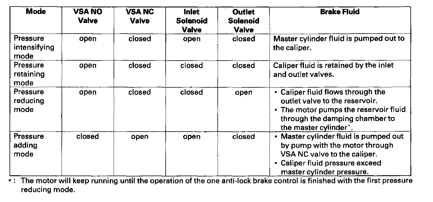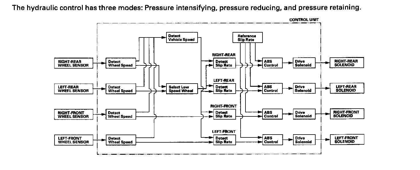The hydraulic control has three modes at ABS action; pressure intensifying, pressure retaining, and pressure reducing. And pressure adding mode is combined at TCS, VSA, and brake assist action.