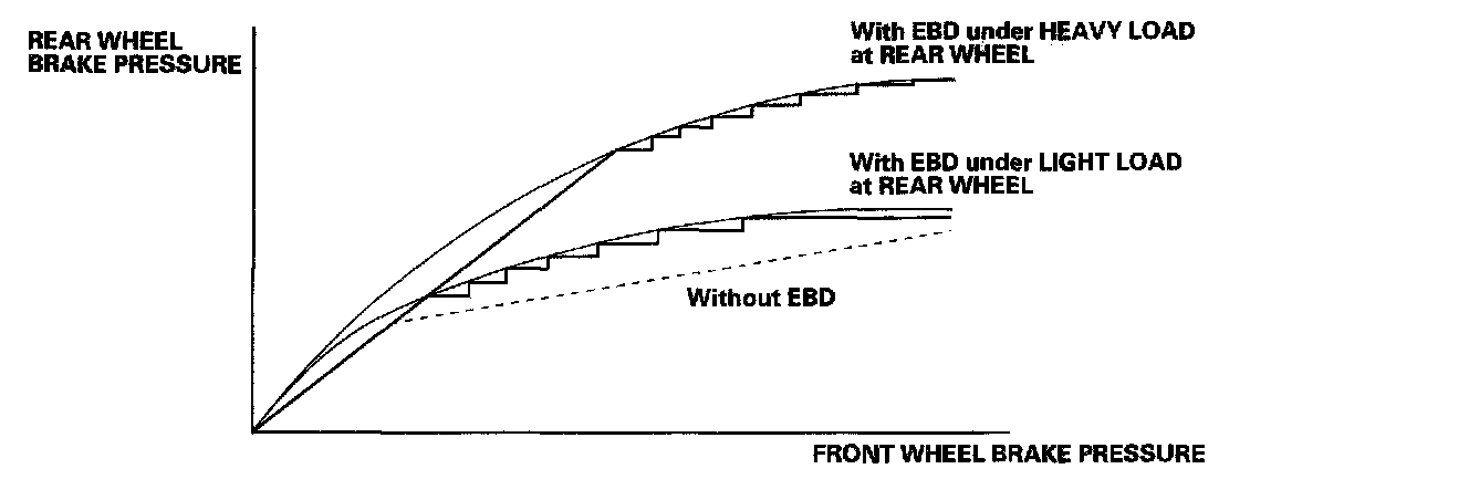The electronic brake distribution (EBD) feature helps control vehicle braking by adjusting the rear brake force in accordance with the rear wheel load before the ABS operates. Based on the wheel sensor signals, the control unit uses the modulator to control the rear brakes individually. When the rear wheel speed is less than the front wheel speed, the VSA modulator-control unit retains the current rear brake fluid pressure by closing the inlet valve in the modulator. As the rear wheel speed increases and approaches the front wheel speed, the VSA modulator-control unit increases the rear brake fluid pressure by momentarily opening the inlet valve. This whole process is repeated very rapidly. While this is happening, there is kickback at the brake pedal.