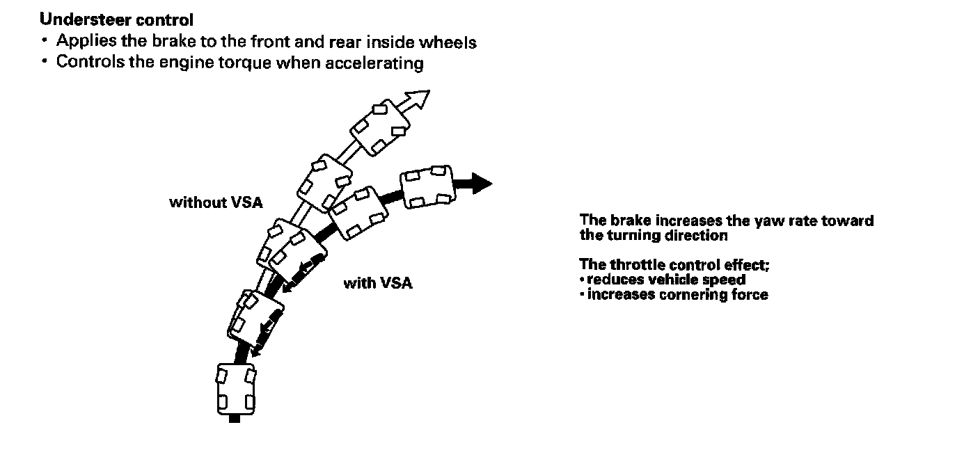 When a drive wheel loses traction on a slippery road surface and starts to spin, the VSA modulator-control unit applies brake pressure to the spinning wheel and sends engine torque control request to the ECM/PCM to slow the spinning wheel and keep traction.