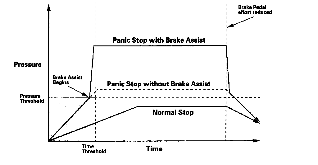 Each time the ignition switch is turned ON (II), the VSA modulator-control unit learns the current driver's normal braking characteristics by monitoring the brake pressure sensor and the brake pedal position switch at each stop. Using these inputs and their values, the VSA modulator-control unit is able to learn the driver's normal braking habits, and then determine the difference between a normal stop and a panic stop for the individual driver of the vehicle. If during a panic stop the VSA modulator-control unit determines that the brake system pressure increases above a learned threshold in less than a learned amount of time, the VSA modulator-control unit engages brake assist. Because the brake system pressure crossed the threshold before the time threshold had expired, the VSA modulator control unit goes into brake assist mode.