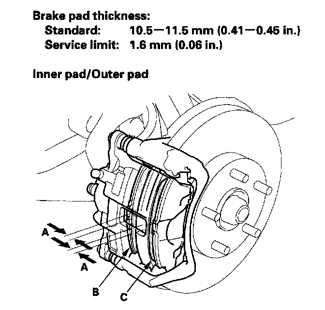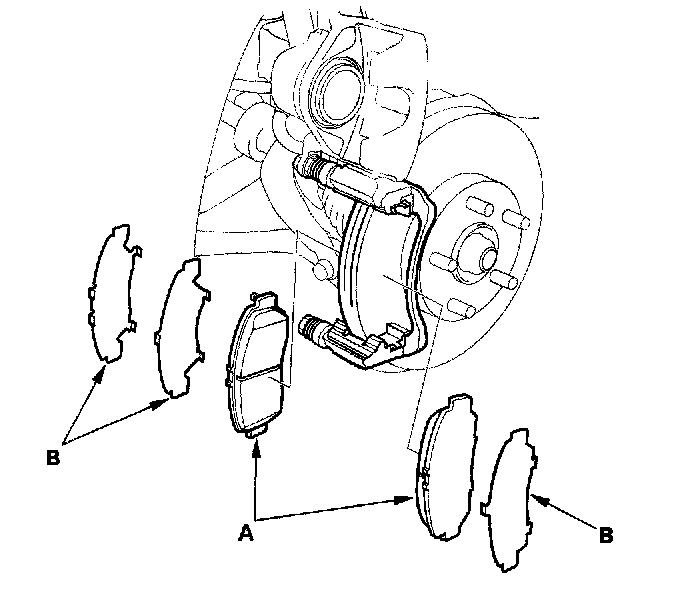 3. Check the thickness of the inner pad (A) and outer pad (B). Do not include the thickness of the brake pad backing plate.