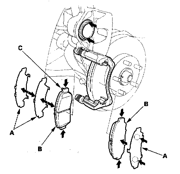 Install the brake pads with the wear indicator (C) on the inside. The wear indicator should be on the top of the pad.