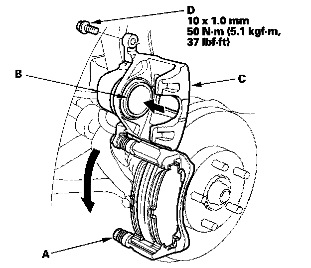 14. Pivot the caliper (C) down into position. Install the flange bolt (D), and tighten it to the specified torque while holding the pin A with a wrench being careful not to damage the pin boot.
