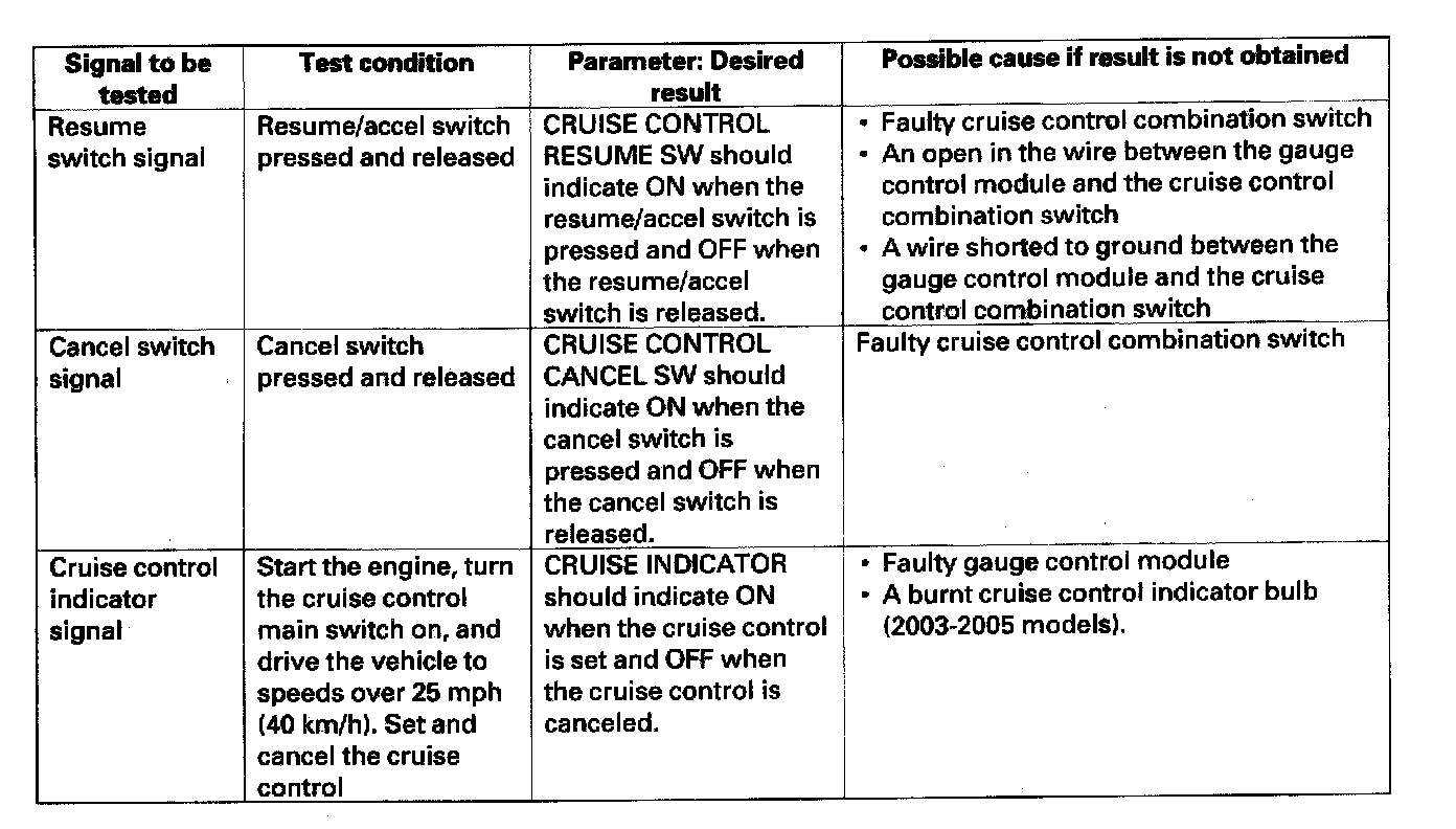 NOTE: Intermittent failures are often caused by loose circuit connections. While monitoring cruise control inputs, flex their circuits, and note if any of the test result change.